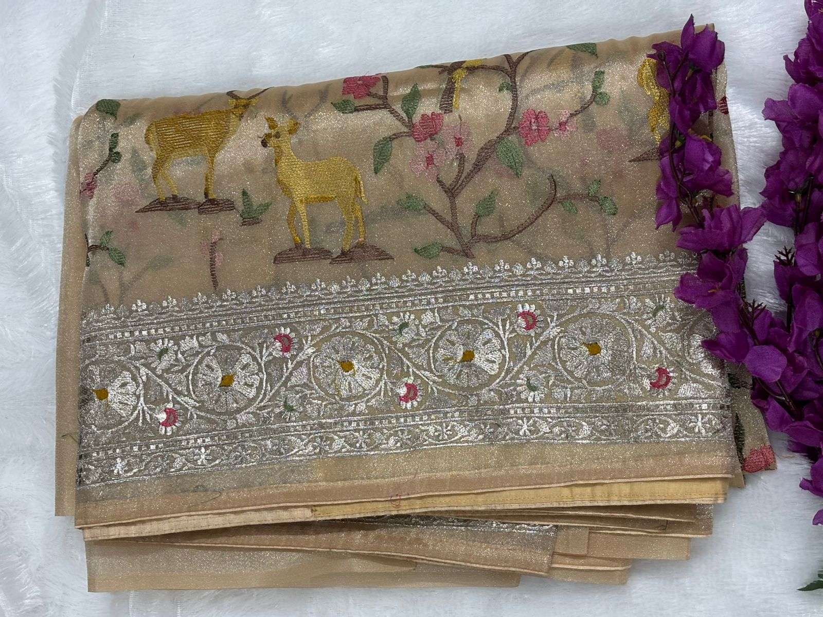 Cream Deer motifs Tissue Saree with German Silver Border