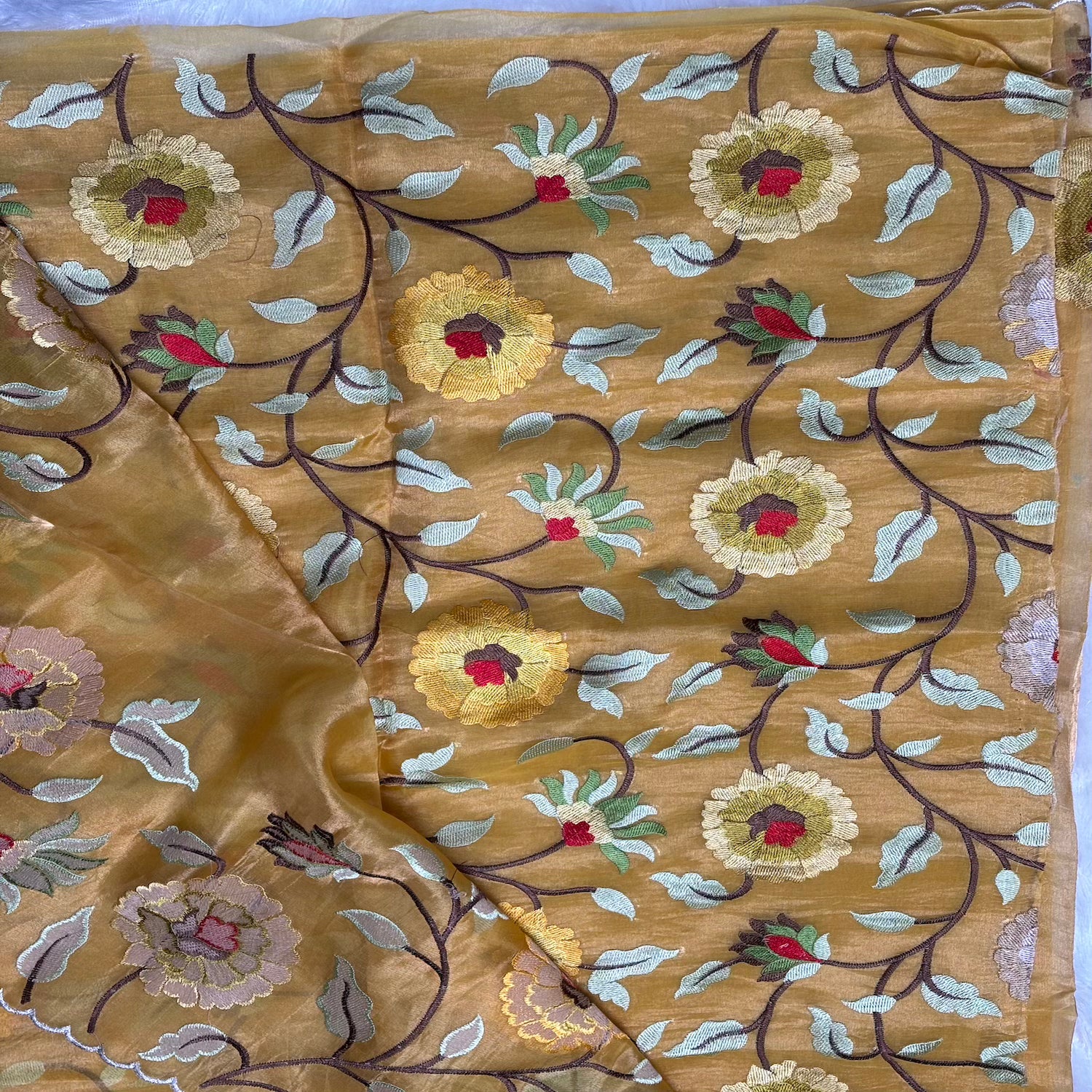 Elevate your ethnic wardrobe with this exquisite golden yellow tissue saree, crafted from pure, lightweight fabric that drapes beautifully. Intricate floral embroidery adorns the piece, adding sophisticated detail and timeless elegance. The delicate tissue construction ensures comfort in warm weather while maintaining a refined appearance. Perfect for festive occasions, celebrations, or formal gatherings, this saree combines traditional craftsmanship with contemporary design sensibilities. An investment piece that transcends seasons and trends.