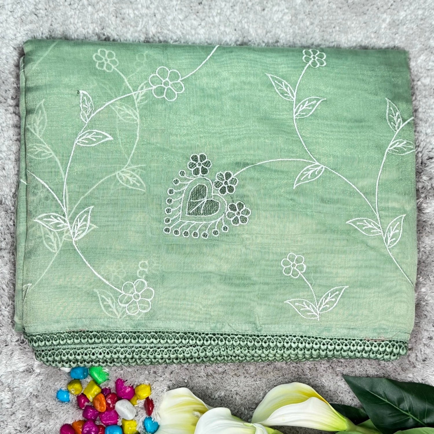 Elevate your ethnic wardrobe with this exquisite pastel mint tissue saree, featuring delicate embroidered floral motifs that showcase refined craftsmanship. The lightweight tissue fabric drapes gracefully, offering comfort without compromising on elegance. Perfect for festive occasions, weddings, and celebrations, this saree combines traditional artistry with contemporary aesthetics. The soft mint hue complements various skin tones, while the intricate embroidery adds a sophisticated touch. An ideal choice for those who appreciate timeless design and quality craftsmanship in their traditional attire.