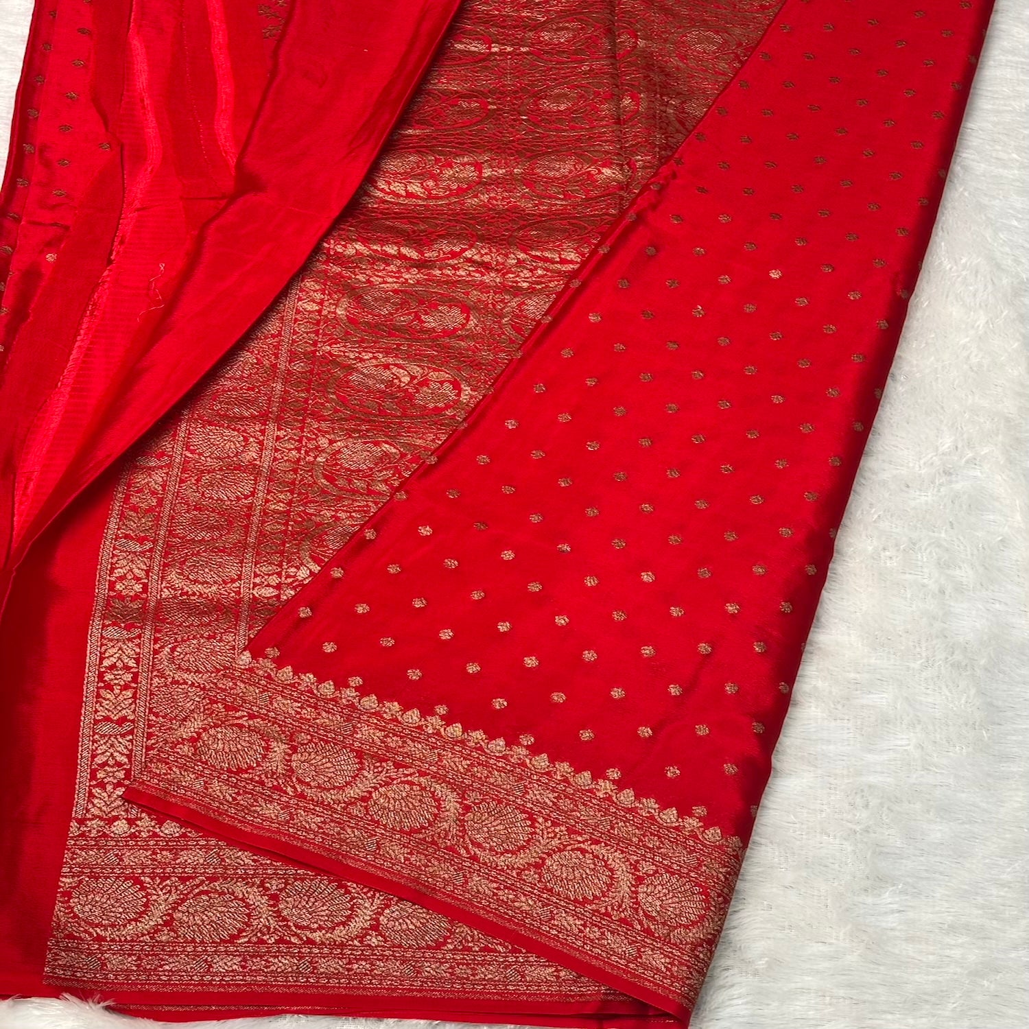 A classy and elegant Red handloom saree having intricate antique golden zari work all over. The saree showcases a beautifully woven floral border and a grand pallu filled with traditional motifs, making it perfect for poojas, weddings, or any festive celebration.