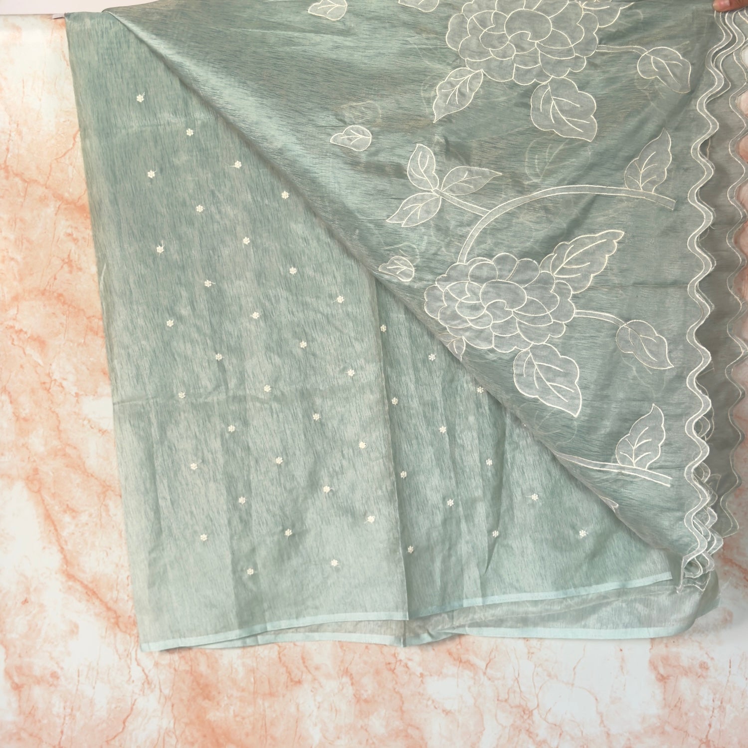 Sea Green Soft Tissue Organza with Applique and Scallop Work Saree