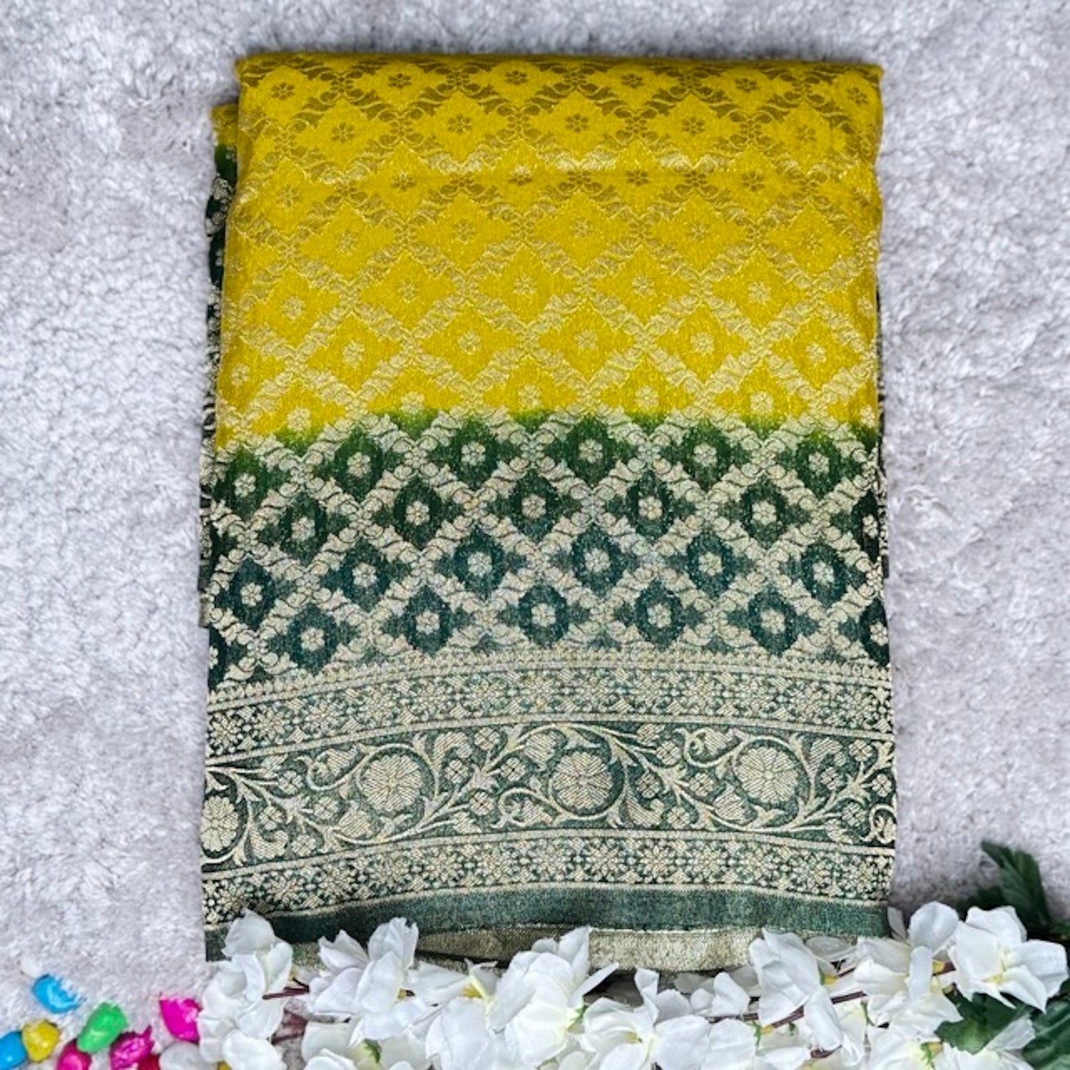 Elevate your ethnic wardrobe with this exquisite Yellow n Green Khaddi Georgette Saree, a masterpiece that seamlessly blends traditional craftsmanship with contemporary elegance. The luxurious Khaddi Georgette fabric drapes beautifully, offering a fluid silhouette that flatters every body type.